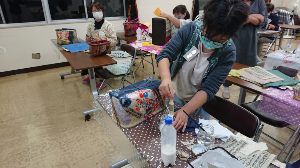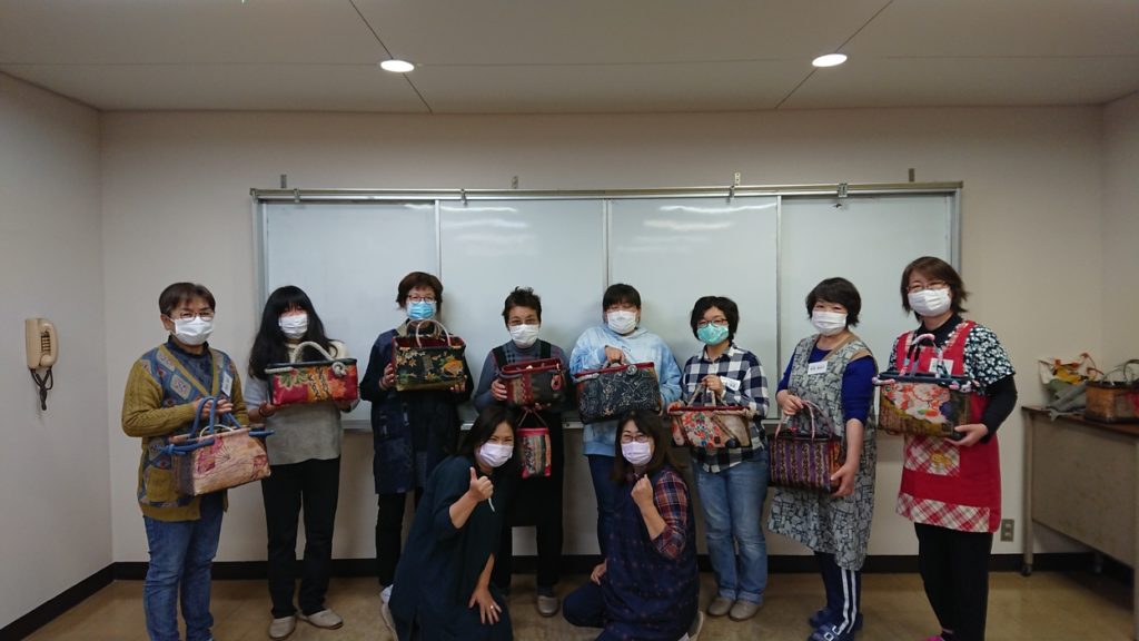 かごに和紙と布を張り重ね、仕上げに柿渋を塗って深みのある味わいになる一閑張り。配色やデザインを思い浮かべつつ、受講者同士で鑑賞し合いながら、それぞれ思い思い、世界に一つしかないすてきなかごバッグが仕上がりました。