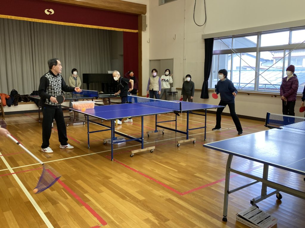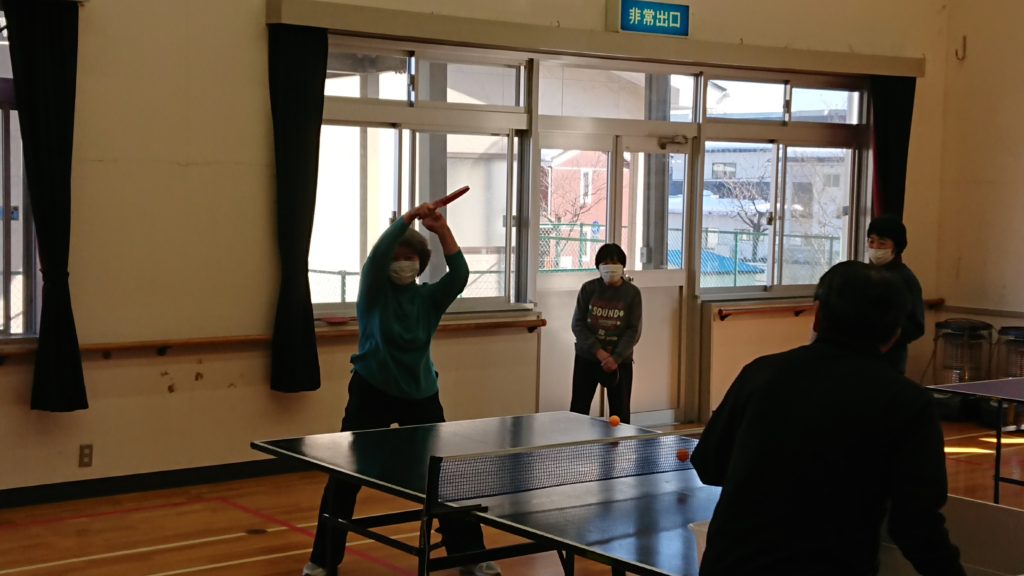 最終日は、卓球のルールを学んだあとシングルスとダブルスのゲームに挑戦しました。相手をうかがいながらドライブやカットなど小技に挑戦する方や、確実なレシーブに徹する方。揺さぶって果敢にスマッシュを決める方などそれぞれゲームを楽しんでおり、外は寒かったですが、ホールでは熱い戦いが繰り広げられていました。
