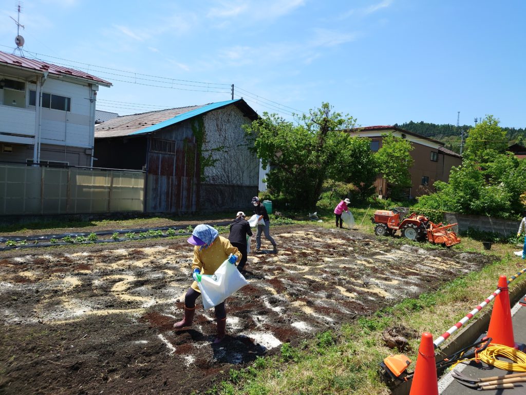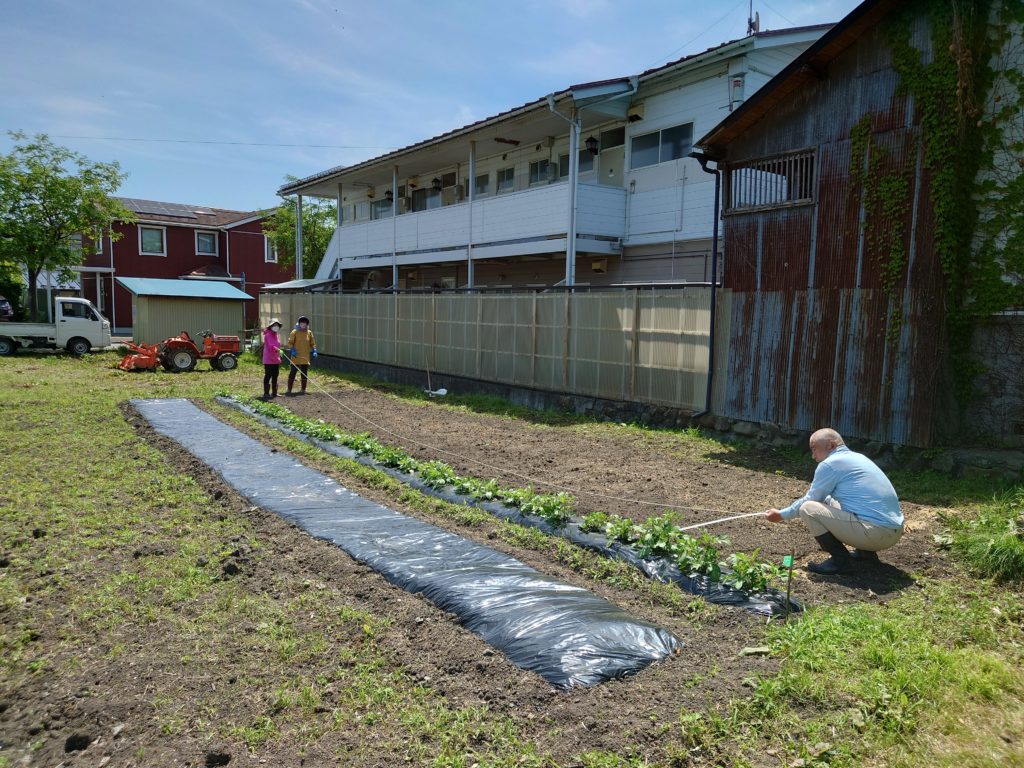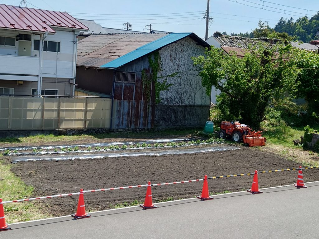 中里まちづくり協議会第1プロジェクトチームの方々と放課後子ども教室指導員さん方で、まずは畑の整地からスタートです。生い茂った雑草を取り除き、木の根や石を拾い、土を耕し、畝を作って、マルチをかけ…あっという間に畑の完成!