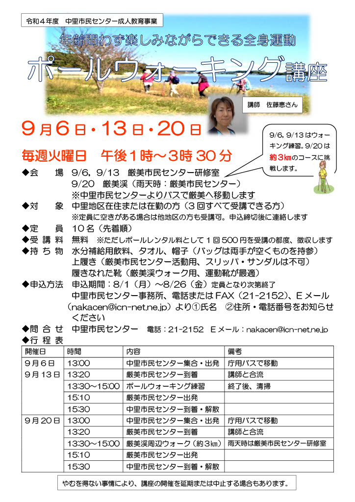 厳美への移動研修となります。最終日は秋の厳美渓を楽しみましょう。詳しくはチラシをご覧ください。【ポールウォーキング講座募集チラシPDF版】