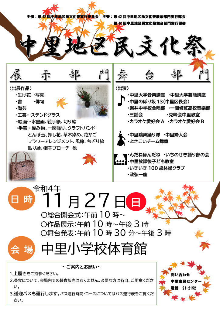 当日は、バス運行をいたします。バスの運行時間・コースは下記の【PDF版】中里地区民文化祭バス運行表をご覧ください。