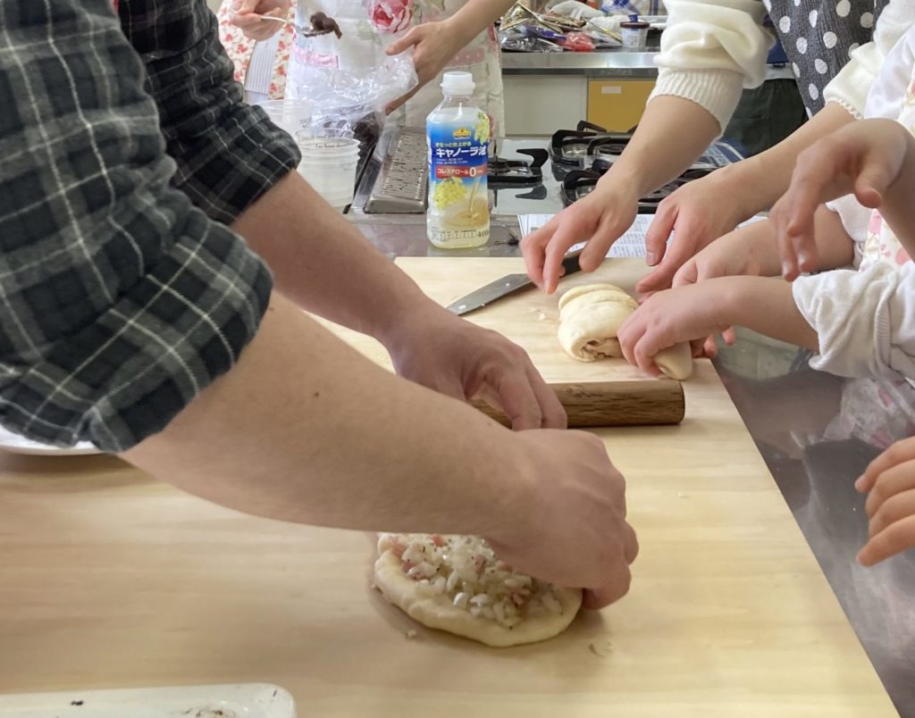 2月4日(土)に家族で楽しむ!クッキング講座を開催し、オニオンパン・ウインナーパン・塩パン・動物パンの4種類を作りました🍞
