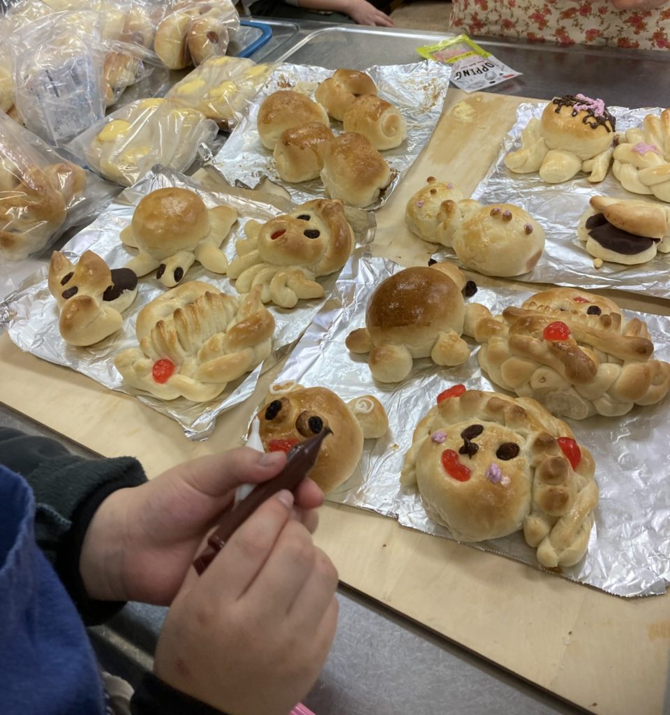 動物パンでは、女の子・カメ・雪だるま・パンダなど工夫しながら形を作り、目にはレーズン、唇や髪飾りにはドレンチェリーをつけ可愛らしく仕上げてオーブンで焼きました。焼き終わり、熱を冷ましてからチョコでデコレーションをしていきました。