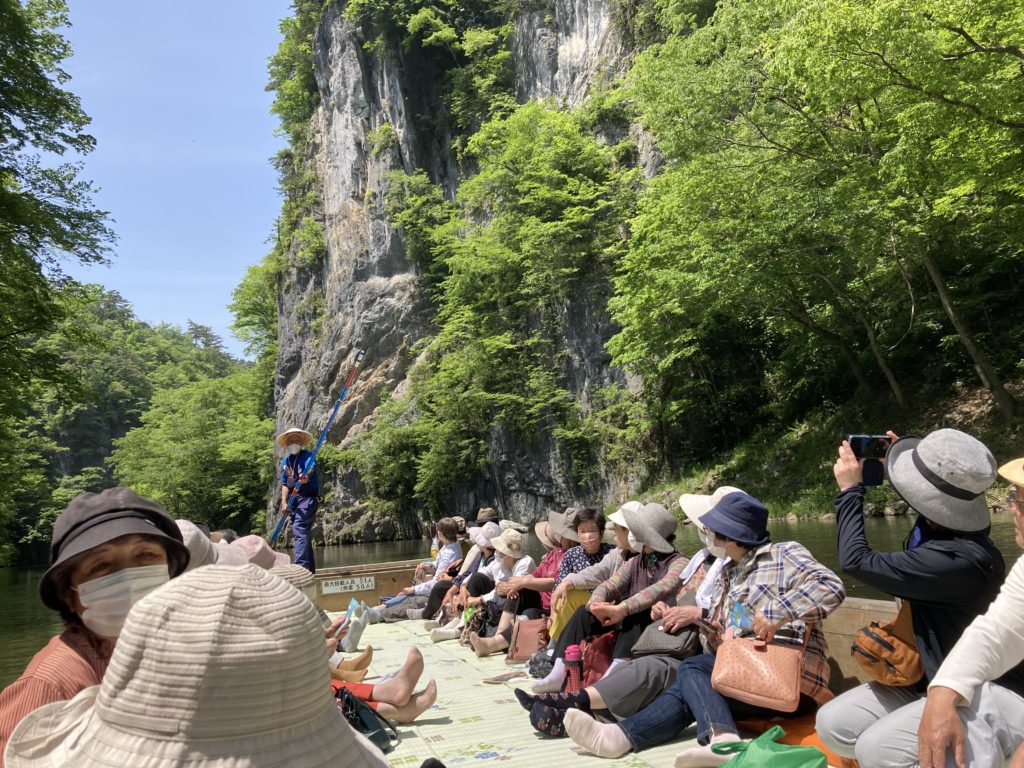 久々に猊鼻渓の舟下りに来たという方がほとんどで、改めて岩肌の雄大さ、自然の豊かさを味わっていました。また、船頭さんのお話が大変面白く思わず聞き入ってしましました。舟下りクライマックスでは船頭さんによる「げいび追分」「南部牛追い唄」の生歌唱があり、聞きほれていました。コロナ前の日常が徐々に戻りつつあり、県外からの修学旅行生や海外からの観光客でにぎわいをみせていました。