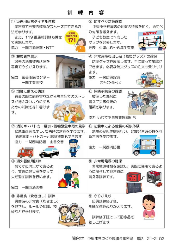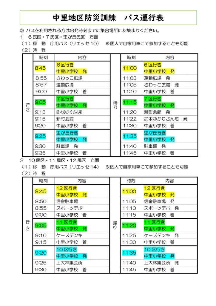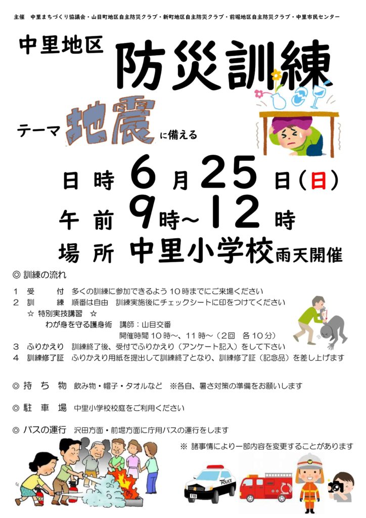 6月25日に中里小学校校庭・体育館にて中里地区防災訓練を実施します。(雨天決行) 訓練のテーマは「地震に備えて」です。 地震が起きた際に命を守る対策として、必要な「知識・行動・人とのつながり」を得られる内容となっております。 また、沢田方面(6・7・里が丘民区)と前堀方面(10・11・12民区)には当日バスが運行いたします。詳しくは、下記チラシ・バス運行表をご覧ください。
