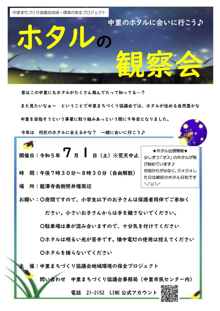 今年もあっという間に夏至を迎え、ホタルがちらほら飛び始める季節となりました。すっかり恒例となった「ホタルの観察会」を開催します。