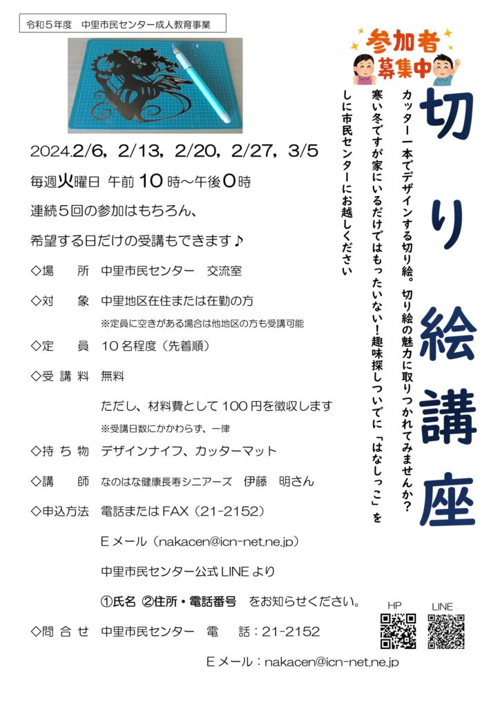 例年より雪が少ないとはいえ、寒い日が続きますがみなさまいかがお過ごしでしょうか。2024年も中里市民センターがみなさまにとって「居心地のいい場所」となるよう、様々な事業を展開してまいりますのでどうぞよろしくお願いします。