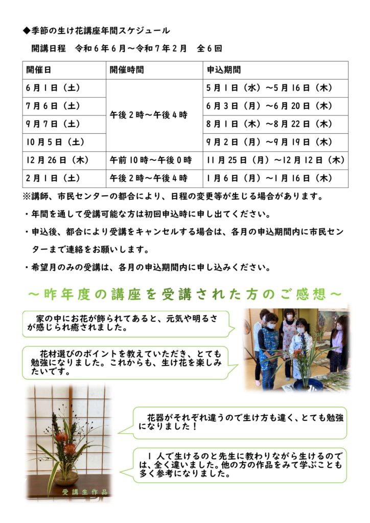 季節に合わせた花を生け、忙しい毎日から離れ、心落ち着ける時間を過ごしませんか? 年6回開講し、年間を通した受講はもちろん、都合の良い月だけの参加も可能です。生け花初心者の方も大歓迎♪花器・剣山のレンタルも可能です!講座を見学してみたいという方も気軽にご連絡ください❁