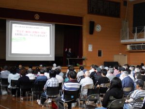 中里まちづくり協議会では、6月23日(日)に中里地区住民ほか約250人が集まり、防災訓練を実施しました。今年度は2部制にし、第1部では「死なないための地震対策!~命と生活を守る対策、3つの具体的なポイント~」と題し、YouTubeでおなじみの高荷智也氏の講演。第2部では講演をもとにした、「命を落とさない・助け合う・生き延びる」ための13項目の訓練を行いました。