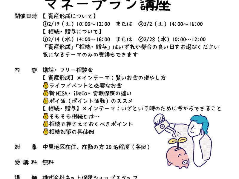生きていくうえで、お金にまつわる悩みはつきもの。相談しようにもどうしていいのか、誰に相談したらいいのかわからないことが多いですよね…。そこで、中里市民センターでは少しでもお悩みを解消できないかと2~ …