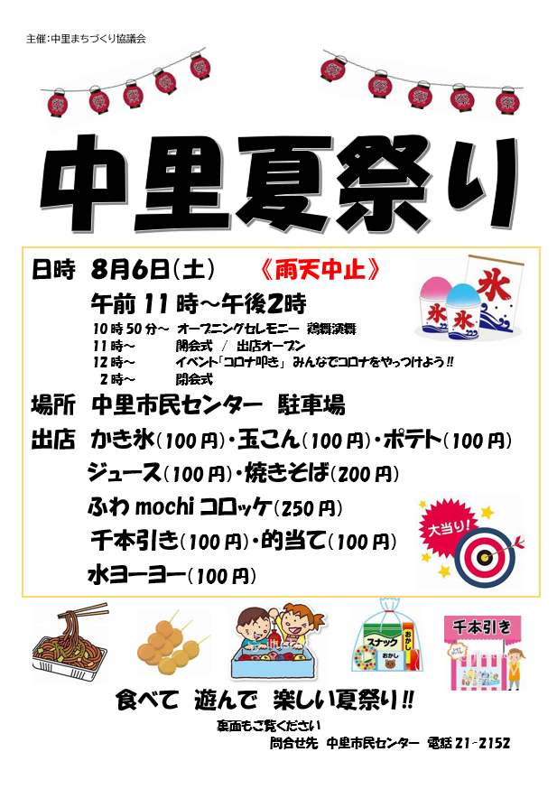 8/6(土)中里夏祭りは、コロナウイルス感染症対策を強化し開催いたします📣〇受付➡検温、手指消毒、名簿記入、色付きマスクへの交換〇飲食➡屋外の決められた飲食スペースでご協力お願いいたします!